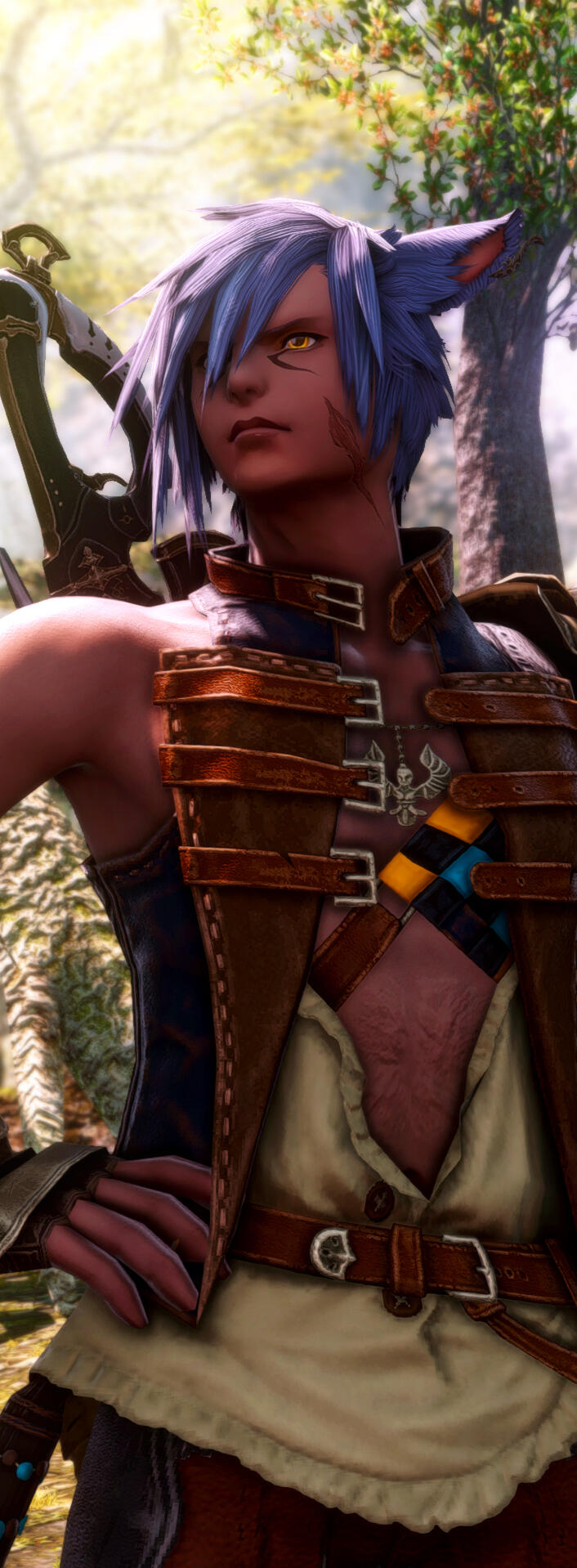 Within the arid plateau of Wightrock, nestled amidst the eastern peaks of Abalathia's Spine, rested the hunting grounds of the Vererkrya tribe. Composed of four converging family clans, the band of Keepers was one that refrained from progressing past Ala Mhigo during the Great Migration, instead intending to remain within the desert clime.Shri'ke was born to the tribe just upon the arrival of the Sixth Astral Moon of 1551. Being the first son his mother bore following his three elder sisters, he was quickly driven to hone his hunting instincts rather than pursue a role of leadership, as it was intended that he would follow in the steps of his father and become a provider for the Vererkrya. Thus, much of his childhood was spent roaming the desert: learning to stalk, to slice, to shred.To slaughter.In spite of this, the young Miqo'te never quite lost the core of his natural disposition: his strict moral compass; his desire to aid those around him; his belief and trust in the good of others. The latter was tested time and time again, particularly by the Garlean occupants of the region, and one such encounter with them nearly ended poorly for Shri'ke, were it not avoided thanks to the intervention of Gwenäelle, an aged Temple Knight who happened to be witness to the incident in Ala Ghiri and sought to intervene before a child could come to harm.