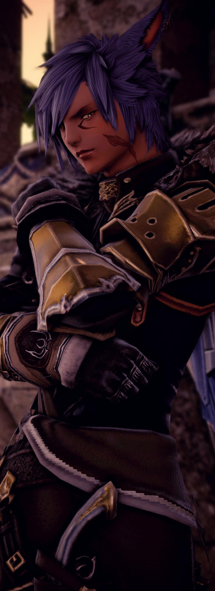 For certain Ishgardian roleplayers: yes, he's a Miqo'te outsider in the Temple Knights. This character was designed to explore the concept of an outsider gaining rank that he otherwise wouldn't be afforded within the militant structure of the Holy See, save for the dire circumstances wrought by the Calamity. Primarily, I wanted to unite different areas of FFXIV lore that I'm deeply immersed in (see: Miqo'te and Ishgard) as a personal challenge for narrative craft. His story is built in such a way that more lore-abiding Ishgardian roleplayers can dismiss his rank as something he didn't deserve or that they refuse to acknowledge, as determined by their own beliefs (and that I'll happily play off of as it's something I love exploring and interacting with). Nevertheless, if that isn't your cup of tea, no hard feelings!